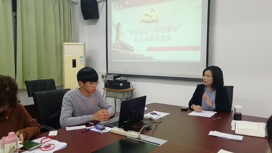 为深入贯彻“不忘初心、牢记使命”主题教育指导意见,夯实理论学习,2019年12月4日晚,太阳成集团tyc17(含18、19)级员工党支部在第七教学楼206会议室召开了“不忘初心,牢记使命”主题教育第三次学习研讨交流会,会议由党支部书记梁嘉仪主持。