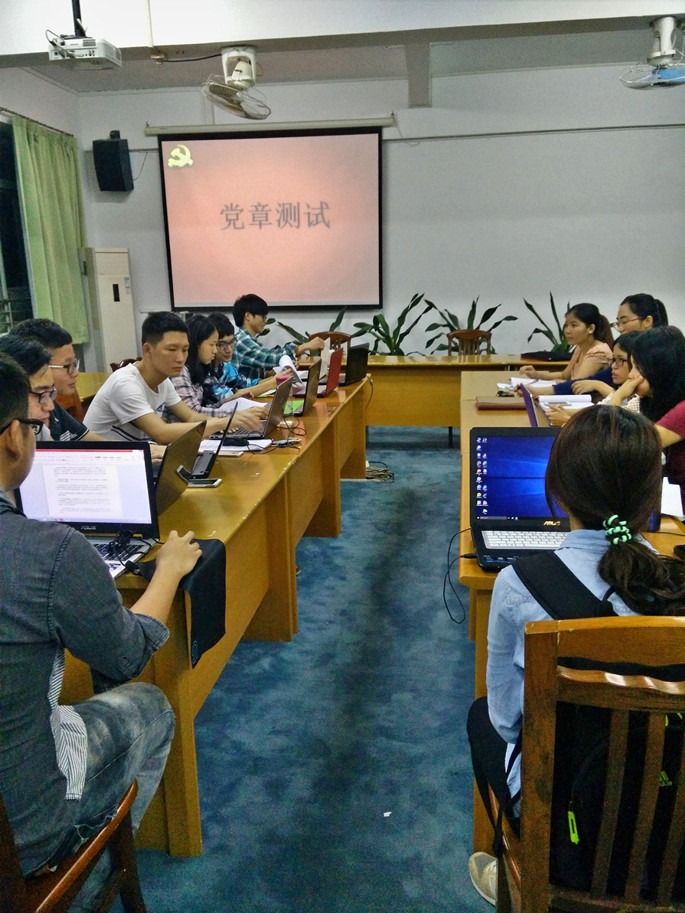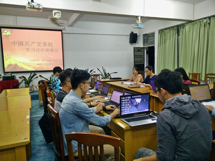 我系员工党支部积极响应省委教育工委的号召,积极开展“学党章 守纪律 当先锋”主题教育活动。法律系13、14(含15)级员工党支部于11月16日晚在D栋教学楼206教室开展了主题为“学党章,促进步”学习讨论座谈会,出席本次活动的主要由法律系13级党支部书记谢萍老师,法律系14(含15)级党支部书记张仁瀞老师以及两个支部的全体党员,会议由13级党支部副书记廖庆华主持。