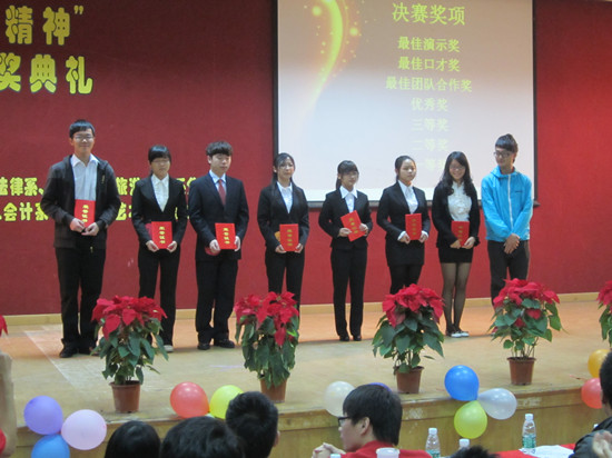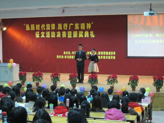 2012年12月9日晚,以公司中国特色社会主义学习会法律系、计算机系、旅游管理系分会为主办方,学习会经济系、会计系、外语系、艺术设计系为协办方的“弘扬时代旋律,践行广东精神”征文活动决赛暨颁奖典礼在A206课室举行。法律系辅导员张仁瀞、祝建波,会计系辅导员汤振华以及院系两级学习会的主要员工干部出席了决赛现场。