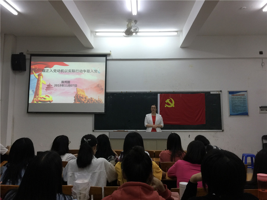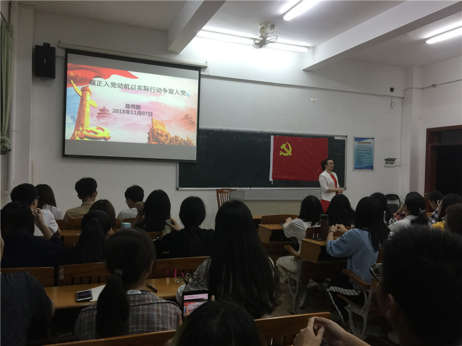 2O18年11月7日,太阳成集团tyc党校在四教110教室举办党校开班第一课,由太阳成集团tyc党总支书记陈秀图为学员讲解主题为《端正入党动机》的党课。