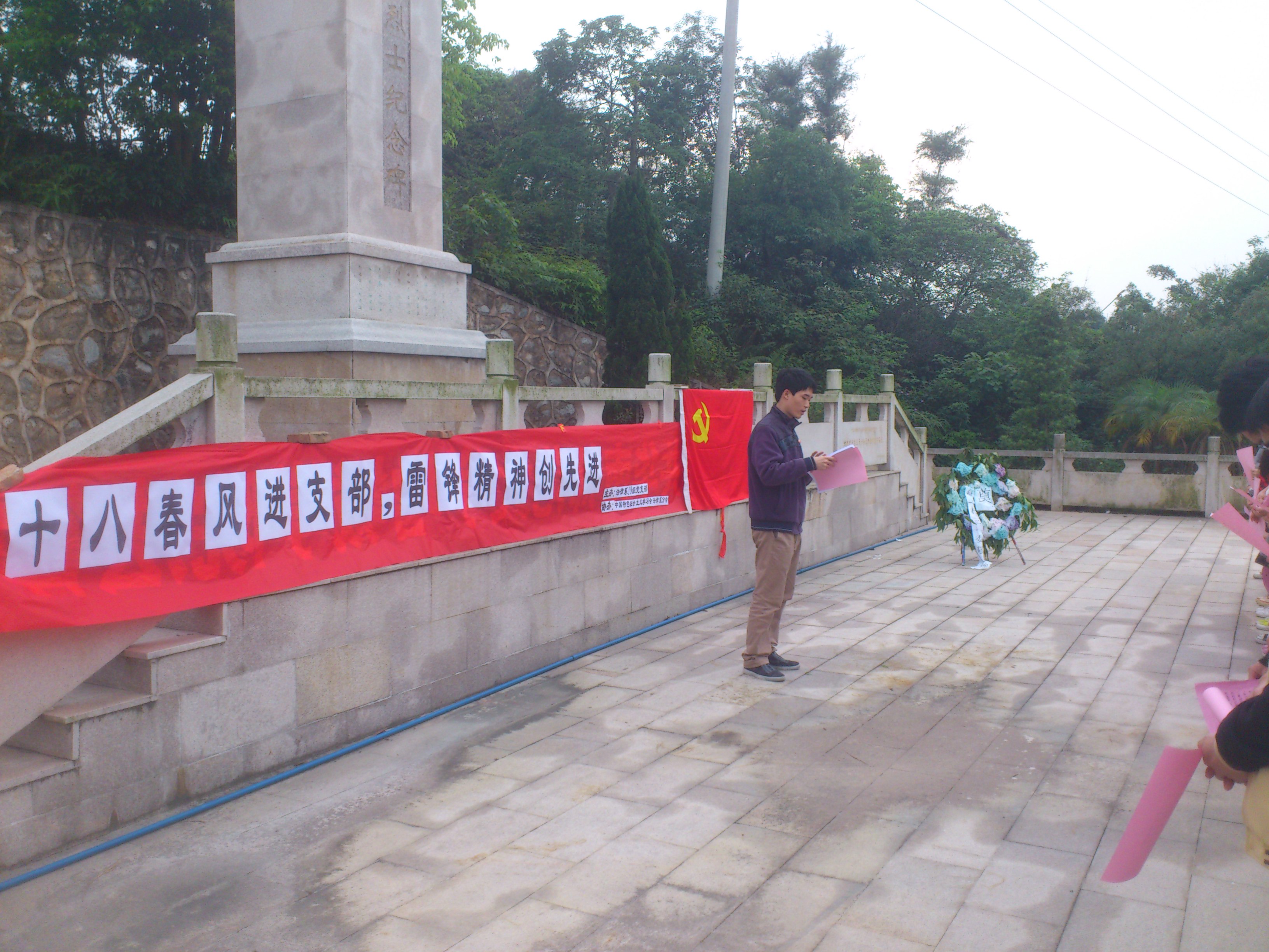 为迎十八大新风,接雷锋精神,法律系10级党支部响应太阳成集团tyc党委的号召,于2013年4月7日16时30分组织全体党员前往旺村革命烈士碑进行党员宣誓仪式,这也是法律系10级党支部特色活动的启动仪式。本次活动由法律系10级党支部书记张仁瀞带队,中国特色社会主义学习会法律系分会协助举办,与87名党员共同见证这神圣而庄严的一刻。