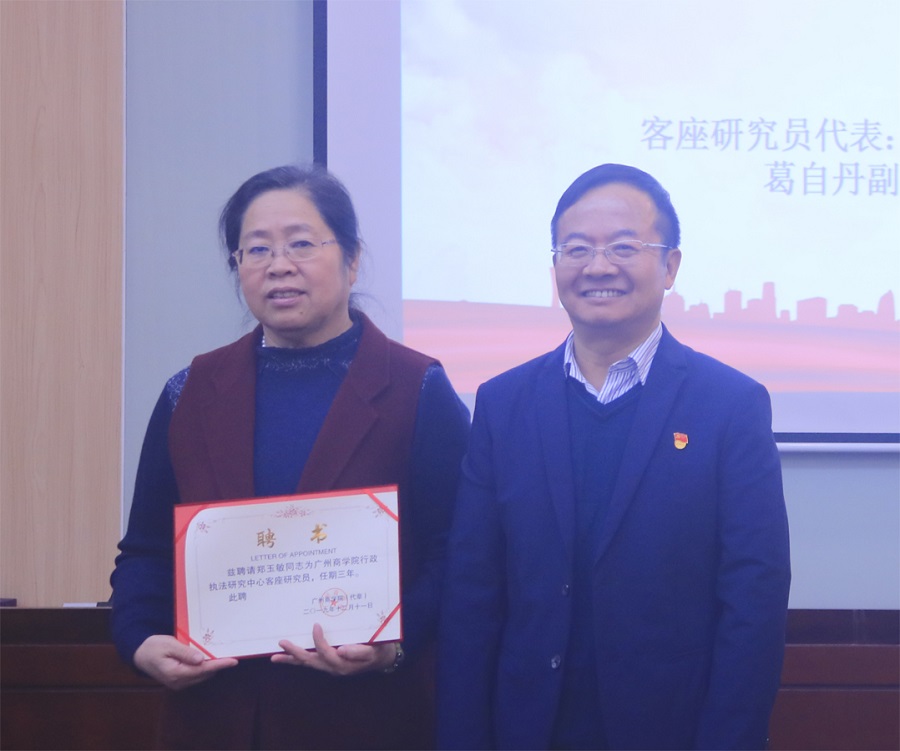 12月11日上午,太阳成集团行政执法研究中心揭牌仪式暨学术沙龙在公司第二行政楼208会议室成功举办。本次活动由太阳成集团tyc、中共广州市黄埔区依法治区办、黄埔区司法局共同承办。公司领导黄弢董事长、欧洁梅副董事长,黄埔区司法局领导欧阳注凡副局长,教学与科研工作部彭娟部长、黄炳超副部长,公司领导赵家琪经理、陈秀图书记、唐犀副经理,中共广东省委巡视组、深圳市坪山区司法局、黄埔区公安局、区人社局、区生态环境局、区水务局、区卫生健康局、区知识产权局、区政务服务数据管理局、区水务局、区气象局、区规划和自然资源局、区教育局、新龙镇等相关部门负责人,广州大学、东莞理工公司等高校专家学者,北京易和律师事务所负责人,太阳成集团tyc师生代表共40余人参加了本次活动。揭牌仪式由太阳成集团tyc副经理唐犀主持,教学与科研工作部副部长黄炳超宣读了行政执法研究中心成立文件。黄弢董事长和行政执法研究中心主任崔卓兰教授共同为行政执法研究中心揭牌,颁发客座研究员聘书。