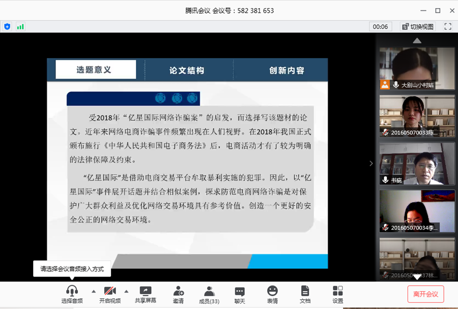 答辩开始前,答辩秘书宣读答辩工作注意事项,并对答辩顺序、设备调试、网络支持等方面作了具体要求。线上答辩还是按照线下答辩的基本流程,由员工陈述论文主要内容,然后答辩老师们就选题思路、论文结构分析等方面进行提问,同时对同学们的论文进行点评,提出修改的意见和建议。每组三位答辩老师对毕业论文成绩在线上完成评定。