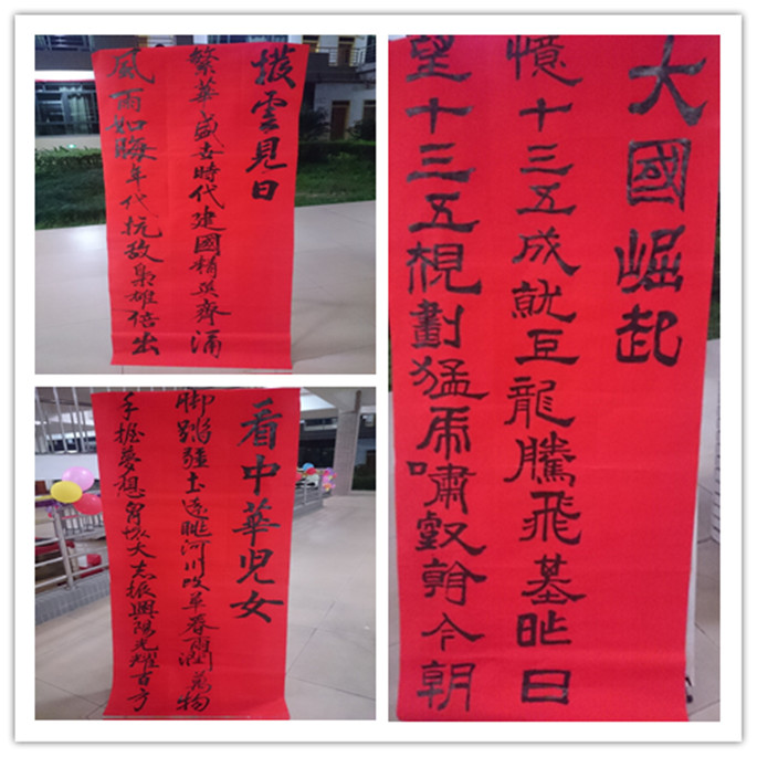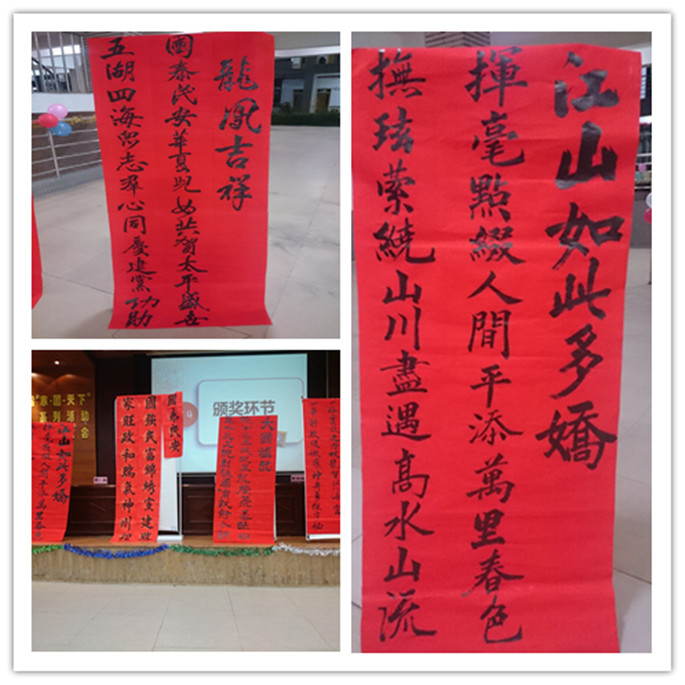 在本次活动中,各组学员积极准备一副副工整妙哉,意境深远的对联,共收到134份作品,112份通过原创审查,涌现出很多优秀的作品。公司分会对每副对联进行严格把关和打分,共评选出一等奖作品1副,二等奖作品2幅,三等奖作品4幅。其中,2014级学员邱琳茹、薛美娴同学的作品“繁华盛世时代建国精英齐涌,风雨如晦年代抗敌枭雄倍出”表达了祖国不同时期人才倍出的称赞;2013级学员陈方玙的作品“挥毫点缀人间平添万里春色,抚玹萦绕山川尽遇高山流水”同韵相压,给人以和谐悦耳的美感;2014级学员汪开开的作品“忆十三五成就巨龙腾飞基昨日,望十三五规划猛虎啸壑看今朝”则将内容表达得更加丰富多彩和鲜明有力。
