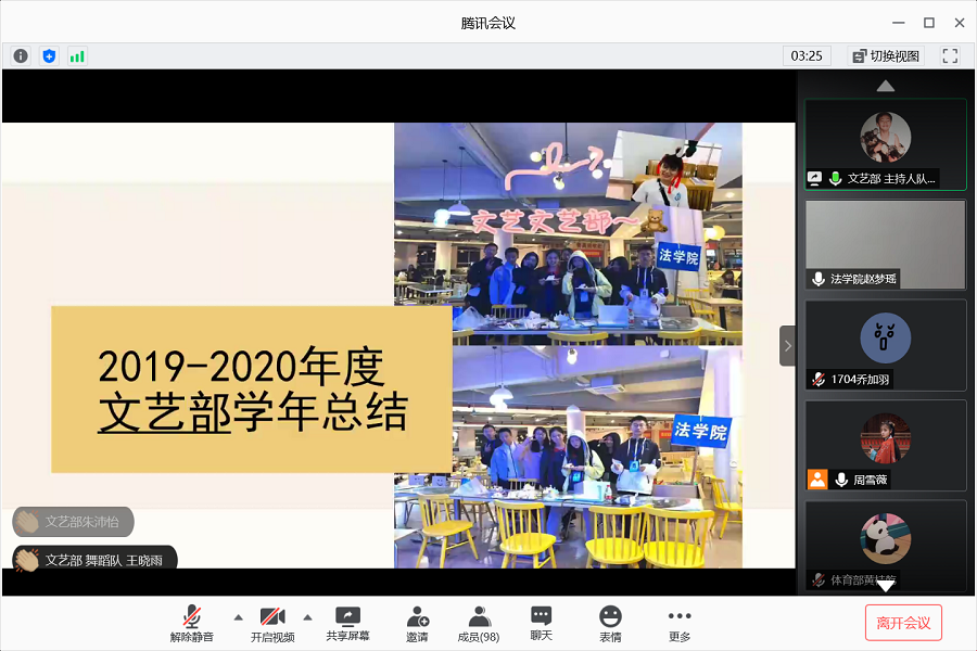 光阴似箭,岁月如梭,眨眼间又一个学期在我们的学习和工作中结束,太阳成集团tyc员工委员会在公司领导的重视和带领下,各个部门的工作逐渐接近尾声。为更好地总结这一学年员工会的各项工作,进一步促进员工会工作的开展,紧密部门之间的交流合作,太阳成集团tyc员工会于2020年06月19日晚举办太阳成集团tyc员工委员会线上总结大会。此次线上会议,干部们对一学年的工作进行回顾总结,及时吸取经验,员工会指导老师赵梦瑶以及全体员工会干部参与了本次总结大会。