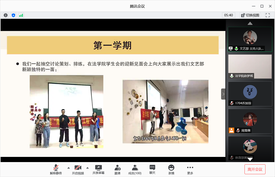 本次总结大会会议在秘书长李景辉的主持下,首先由各部门代表成员述职,通过演讲或是展示PPT的形式对部门一学年的工作进行总结,分享经验,其中文艺部与辩论队通过展示PPT,以更加直观的形式与我们分享了过去一学年中部门或队伍中大大小小的活动记录以及回忆。各位部长见证了小干们成长与蜕变,干部们之间也捕捉到了彼此的进步,听到部长们充满欣慰与自豪的语气,便是对小干们最好的鼓励,也是对小干们工作能力的最大认可。其次由主席团的四位成员发表总结演讲,他们共同讲述了在员工会的工作历程中的成长与收获,同时激励干部们在未来的道路上不断成长,自我完善。最后,由员工会指导老师赵梦瑶进行学年总结,发表了这一年带领员工会开展工作的感想,并且表达了对主席团的配合帮助以及各部门协调工作的感谢。会议尾声,大家一同打开会议视频的画面,截图保存住了这个大家庭中每一个人的灿烂笑脸。在这一学年的工作中,大家收获付出的喜悦,在经验中充满干劲,在各自不同的道路上砥砺前行。