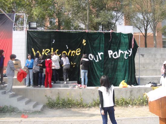晚会布置,是众人对此次活动的第一印象,所以我们也花大量的精力去构思,三方宣传部更是合作紧密,力求为此次晚会呈现不一样的风格。在多次探讨修改下,我们确定了晚会布置——渲染舞会欢快气氛。我们利用人偶米奇带来欢快,带动入场人员小小舞动,并在此留下纪念;我们利用爱心装饰,点缀当晚爱心洋溢。