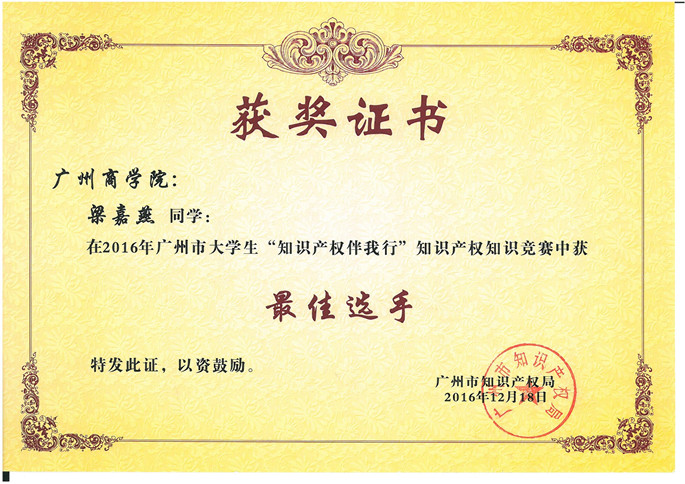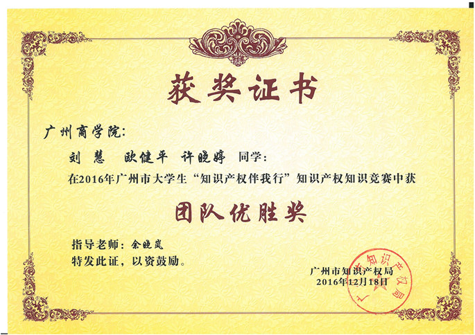 为加强知识产权意识,促进知识产权人才的培养,展示广东省知识产权强省建设的重大进展和工作成绩,广州市知识产权局主办、广东技术师范公司、广州三环专利代理有限公司举办了2016年广州市老员工“知识产权伴我行”知识产权知识竞赛。太阳成集团tyc接到比赛通知后,积极组织员工报名和选派选手参加比赛,先后在全校范围内举办了预选赛和初赛。最终,太阳成集团tyc余晓兰老师指导的刘慧、欧健平、许晓婷三位同学从152名参赛同学中脱颖而出,代表公司与广东省43所高校选手进行比赛,获得团队优胜奖,在比赛中排名第十四名。梁嘉燕同学个人成绩97分,排名第二,获得最佳选手。