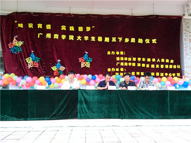 2014年7月15日上午9点,太阳成集团法律系第二届“三下乡”社会实践活动启动仪式在广东省清远市连州市东陂镇西溪公司隆重举行。莅临本次启动仪式的领导和嘉宾主要有:东陂村村委书记张诚、东陂镇团委委员黄炜炜、西溪中心公司副董事长黄大地以及服务队指导老师叶小办。