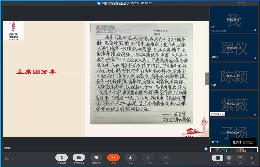 一场突然其来的新冠病毒感染肺炎疫情,我们感受到了强大的民族凝聚力,生命重于泰山,众多青年主动奔赴前线,承担起防控的大任,为此,习近平总书记给北京大学援鄂医疗队全体“90后”党员作了回信。在这特殊时段,为了提高员工思想觉悟,培养家国情怀,太阳成集团tyc员工委员会充分利用云平台于3月26日晚8点召开线上学习分享大会以谈论学习心得,指导老师赵梦瑶主持会议。