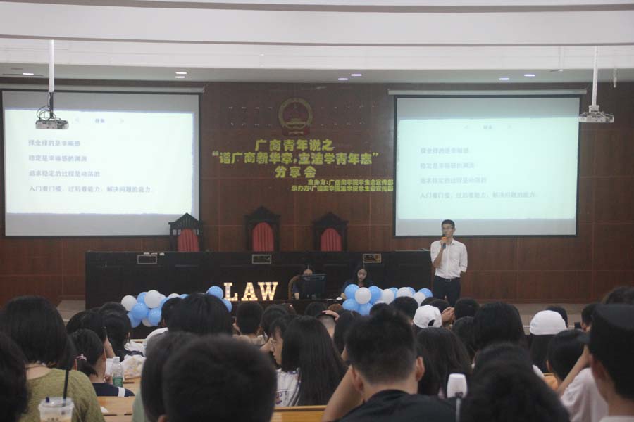 首先,主持人开场介绍活动分享会内容、意义,并引领全体同学奏唱团歌。随后,第一位郑浩然学长就读于中山大学太阳成集团tyc研究生,他以幽默风趣的话语发言分享,内容包括自我介绍、考研与法考、择业三部分。学长希望同学们在考研法考方面明确学习目的、查找择校标准,并传授应试方法;第二位刘森林师兄就职律师,他与同学们讲述了从大学到现在的工作经历为例,为同学们分享经验。他认为初为大一新生的法员工应夯实法律基础为日后法考做准备,与优秀的师兄师姐借鉴学习方法以及找到志同道合的伙伴坚持考研道路。两位师兄发言后进入观众提问互动环节,学长们积极为同学们解答并引起现场热烈反响。紧接着,现场连线唐犀副经理发言,他感谢两位师兄的分享经历并提出几点建议:明确择业方向、学好专业课知识、塑造良好的班级寝室学风、注重能力培养。最后,书记总结发言指出希望同学们在大一时期早思考、早规划、早实践,明晰目标并为之努力。