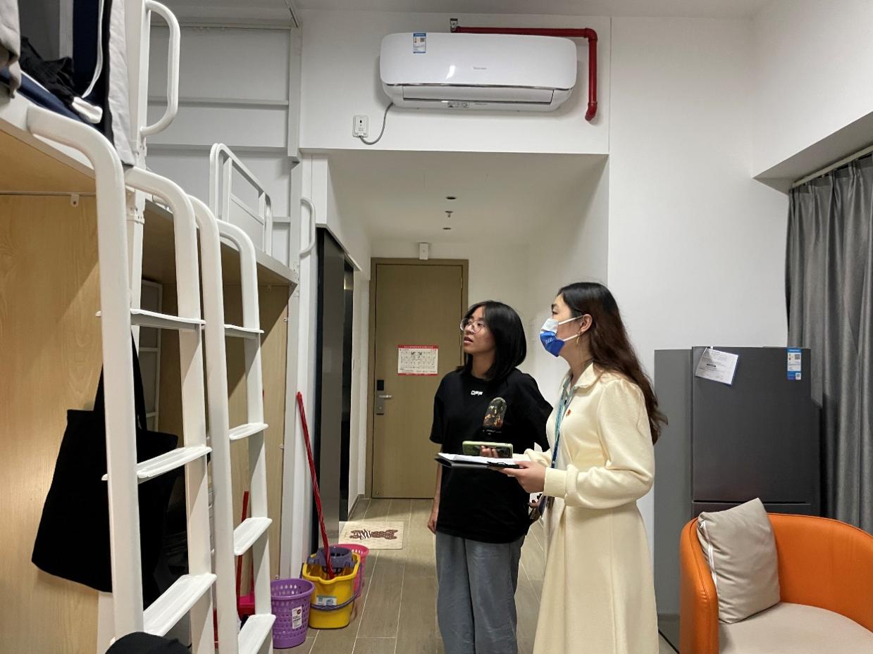 团学工作人员认真检查宿舍卫生环境并做好相关记录,积极与同学们沟通,提醒同学们多留意宿舍卫生和用电安全等事项,共同打造温馨安全、干净整洁的学习生活环境。