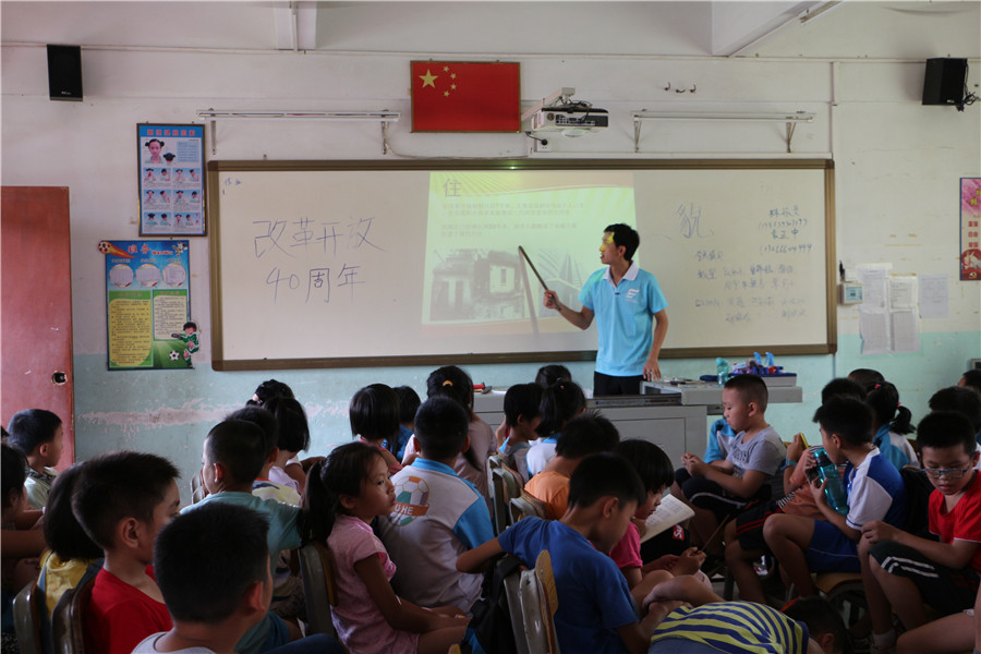 在为期十天的暑期”三下乡“活动中,太阳成集团tyc阳光普法服务队在江门市新会区大泽镇五和小学开展以下活动:(一)上好爱国主义教育课,通过国旗下讲话、班会等渠道,各班开展爱国主义教育,引导全校员工树立正确理想、信念、人生观、价值观,进一步弘扬爱国主义精神,激发了全体员工爱国爱家乡的热度,丰富校园文化生活培养了员工的爱国情感和爱国认识。(二)开展探访红色之旅,走访老党员,参观五和二社爱国主义教育基地,多渠道引导队员向伟人学习,重温革命历史,发扬优良传统,感受民族精神和伟人的伟大力量,体验民族精神的时代内涵,忆苦思甜。(三)召开16场“改革开放40周年”“学习党的十九大”主题班会,引导员工在潜移默化中感知到祖国发展的伟大成就和全国人民万众一心、拼搏进取的爱国情怀,激发员工对自己民族优良传统、优秀文化、建设成就的光荣自豪感。(四)举办“唱红歌,颂党情”红歌合唱比赛,歌唱祖国繁荣昌盛,使同学们能够传承先辈的革命精神,发自内心地为我们祖国而自豪。