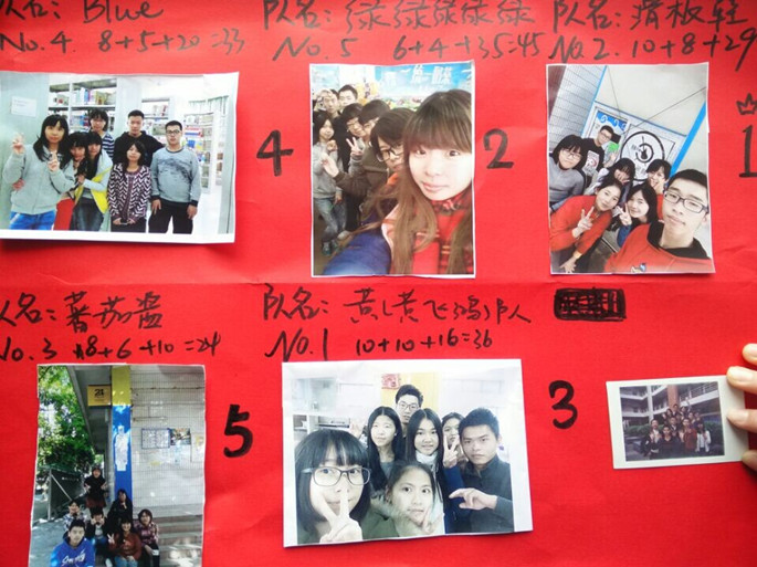 活动开始前,全班同学在班委们的带领下高喊了法学四班的口号“干一票大的”,后开始了以小组为单位进行的两人三足游戏,在游戏中各个组员彼此都相连在绑带上,如同化为一个人,培养了成员的团队合作、团队默契,这个环节起到很好的增进感情的作用。其后的游戏环节:一圈到底、一倒到头、折返跑、终极任务(定点拍照)挑战中,每一个小组成员都一起奔跑着到达每一个项目所在的地点,并通过沟通协作完成每一个关卡,这不仅能够让每个人都意识到自己在团队中都是必不可少的部分,而且很好的让他们之间的羁绊更加紧密。最后,以名牌护卫战作为最后也是最热烈的游戏,同学们开始的任务就是以小组为单位在教学楼A、B栋寻找班委们一早隐藏好的名牌,然后把对手队伍的名牌撕掉,在奔跑的过程中必须保护好自己的安全以及保护组员的安全。游戏环节结束后,进行了颁奖和惩罚环节。最后大家在面对相机的微笑后,开心的结束了今天的户外活动。