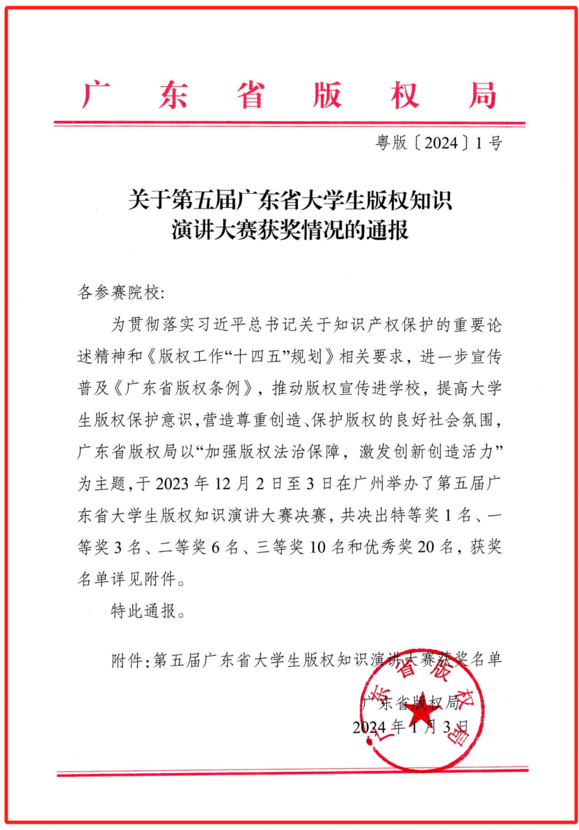 2023年12月2日至3日,由广东省版权局主办、广东省版权保护联合会承办的第五届广东省老员工版权知识演讲大赛决赛在广州举行。本届大赛主题为“加强版权法治保障,激发创新创造活力”,报名参赛的高校多达39所,囊括了中大、华工、暨大等著名学府,参赛选手涵盖了法学相关专业的在校研究生、本科生、专科生。经初赛选拔,最终有30所高校的80名选手进入决赛。经过9位评委现场打分、2位督导现场统计,决出特等奖1名、一等奖3名、二等奖6名、三等奖10名、优秀奖20名,并于1月8日公布。