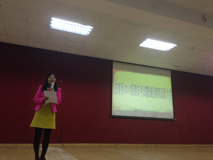 临近期末,2014级新生即将迎来入学来的第一场期末考试,为了让同学们了解考试流程和考场纪律,教育引导新生诚信考试,2014级辅导员张仁瀞老师组织全体员工于1月5日晚在教学楼A206召开法律系2014级期末考试暨诚信教育动员大会。会议由张仁瀞主持并主讲,法律系2014级全体新生出席会议。