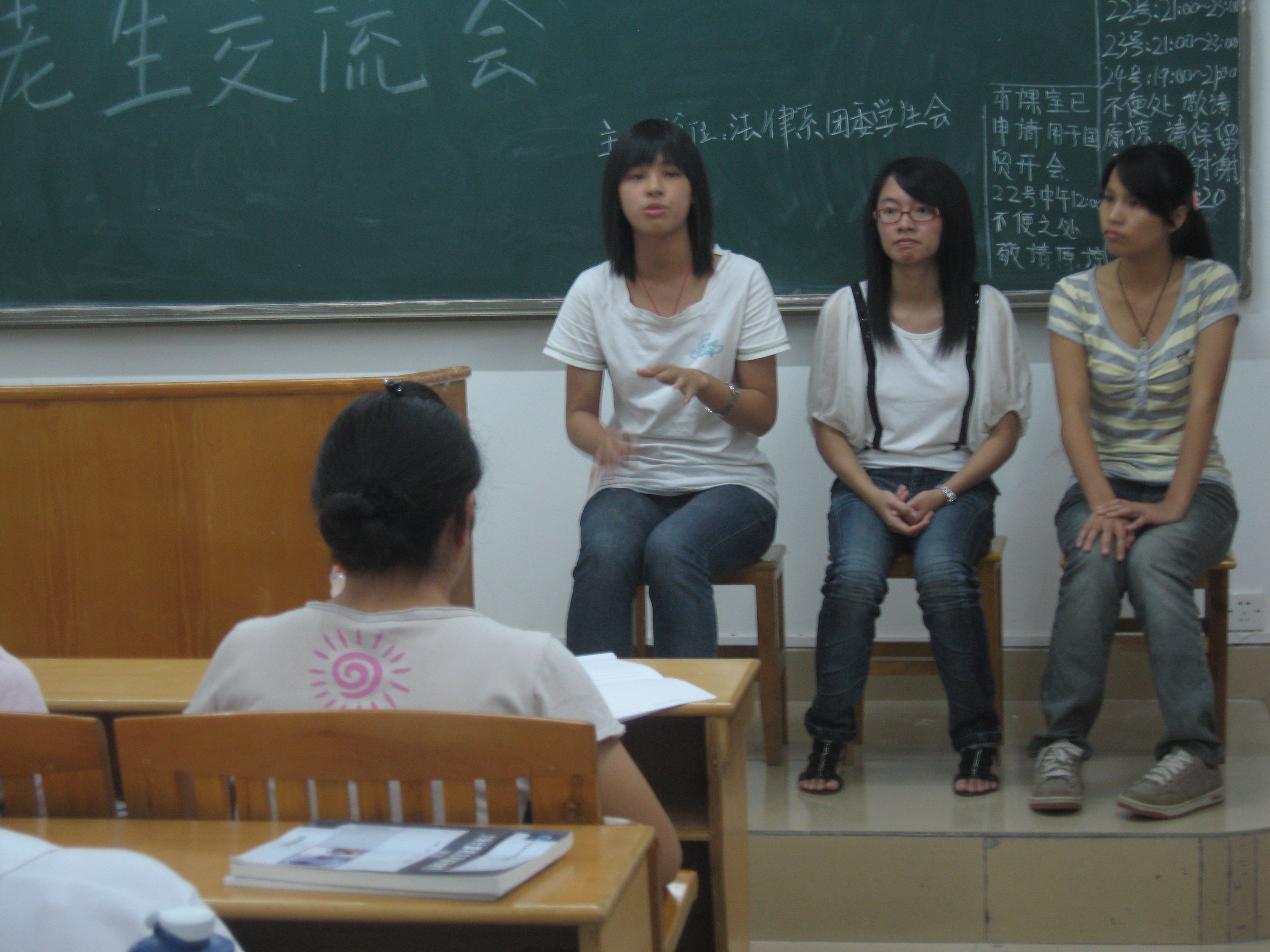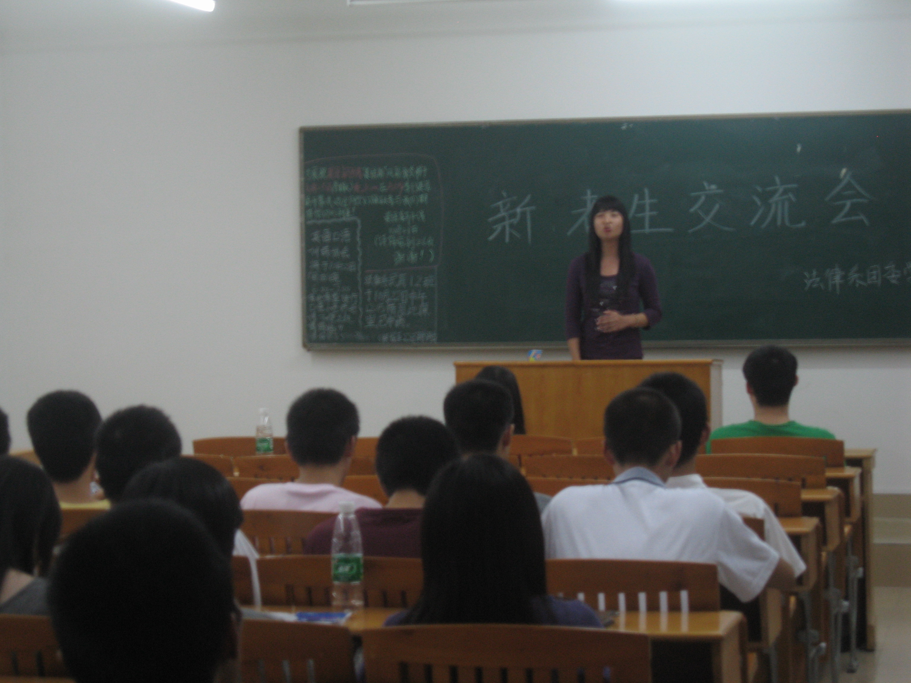 本月21号,我系团委组织部与员工会学习部合作,在公司教学楼D栋209.304.306,举办了09级新老生交流会。参加本次交流会的有我系08级成绩优秀的师兄师姐和团委.员工会的部长,与09级国际经济法.网络信息法.律师实务.行政法.民商法.共5个专业。