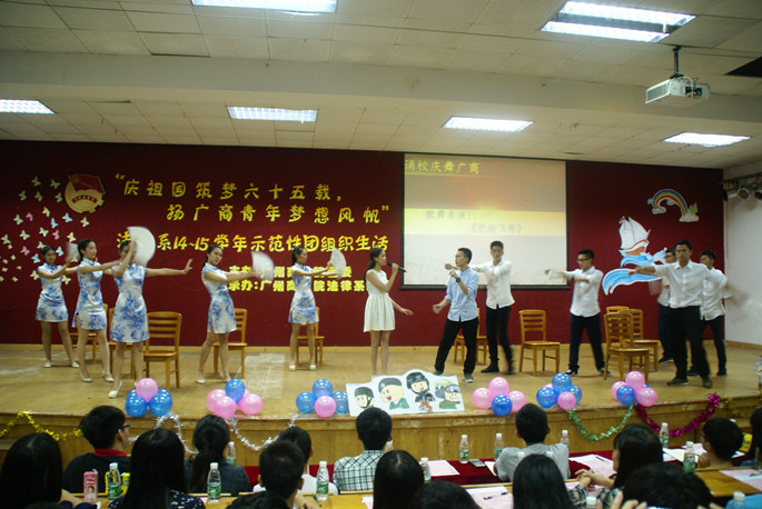 活动期间,法学一班用富有传统色彩的《青花瓷》伴奏,与精妙绝伦的扇子舞相配合,西装与旗袍的中西结合,歌声与舞姿的交相辉映,让我们体验唯美的视觉享受,体现了广商学子的独到视角和创新思维。法学三班诵诗《赞美》,献上对祖国的一份祝福;小品《心系大中国》通过讲述一个剧组拍摄爱国公益宣传片的故事,将同学们爱国爱民、自强不息、艰苦奋斗的精神表现得淋漓尽致;舞蹈《街舞StyleVS三班社会摇》,动感的舞姿,舞出广商学子的青春风采,展现出广商学子的盎然活力。活动末尾播放以“梦想”为主题的视频,让观众缓解紧张氛围。最后,一班和三班以内容新颖,形式多样获得示范性团支部的称号。