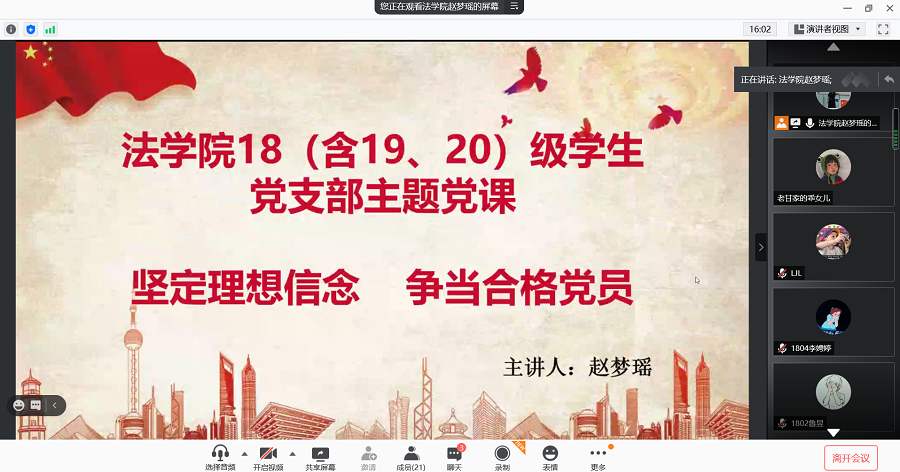 为加强太阳成集团tyc18(含19、20)级员工党支部成员的思想政治教育,引导支部成员坚定马克思主义信仰,坚定理想信念,发挥共产党员的先锋模范作用,2021年1月10日中午,太阳成集团tyc18(含19、20)级员工党支部对支部成员进行“坚定理想信念,争当合格党员”专题党课。参加本次会议的有太阳成集团tyc赵梦瑶老师、覃业敏老师以及太阳成集团tyc18(含19、20)级员工党支部全体成员。会议由赵梦瑶老师主持。