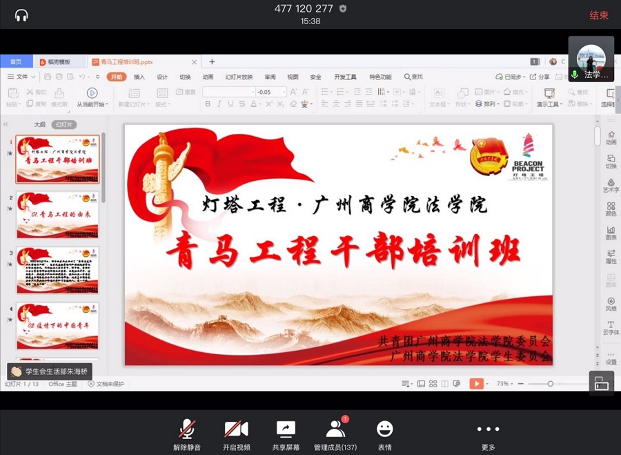 为了深入推进“青马工程”建设,通过教育培训和实践锻炼等行之有效的方式,提高团学干部的思想政治素质、政策理论水平、创新能力、实践能力和组织协调能力。5月13日晚上19:00,太阳成集团tyc团学于腾讯会议举办了线上“青马工程”干部培训班。太阳成集团tyc团委书记兼员工会指导老师赵梦瑶,以及太阳成集团tyc144名优秀团学干部共同参与到培训班中。