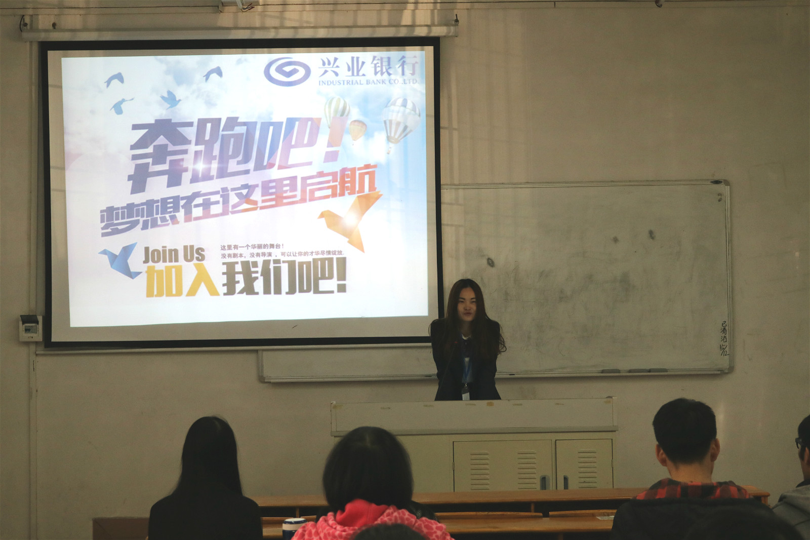 12月16日下午,法律系在教学楼C106举办兴业银行广州分行校园招聘会。兴业银行广州分行零售产品营销中心主任周丽蓉等一行5人出席了本次招聘会。